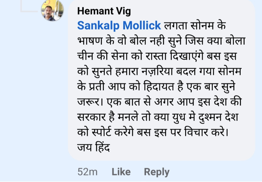 आप ये जो कह रहे है कि सोनम के बोल खराब है, युद्ध में दुश्मन को मदद करेंगे तो जरा सोचना चाहिए कि सोनम ने अपने भारतीय सेना की क्या क्या कर चुके है। तभी इंडियन मिलिट्री सोनम को सपोर्ट कर रहे है। और आपको पता होना चाहिए कि सोनम के साथ 15 लोगो में कुछ लोग रिटायर्ड मिलिट्री पर्सनल कर्नल लेवल के लोग भी उनके साथ समर्थन दे रहे है।